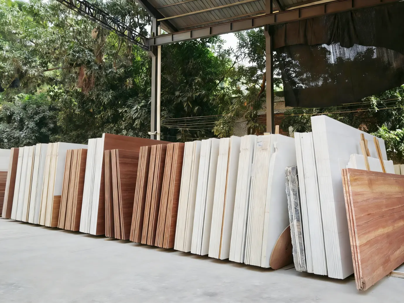 Our factory stores a wide selection of natural marble, quartz and engineered stone slabs. Each slab is carefully organized and inspected before production to ensure consistent quality and color selection.